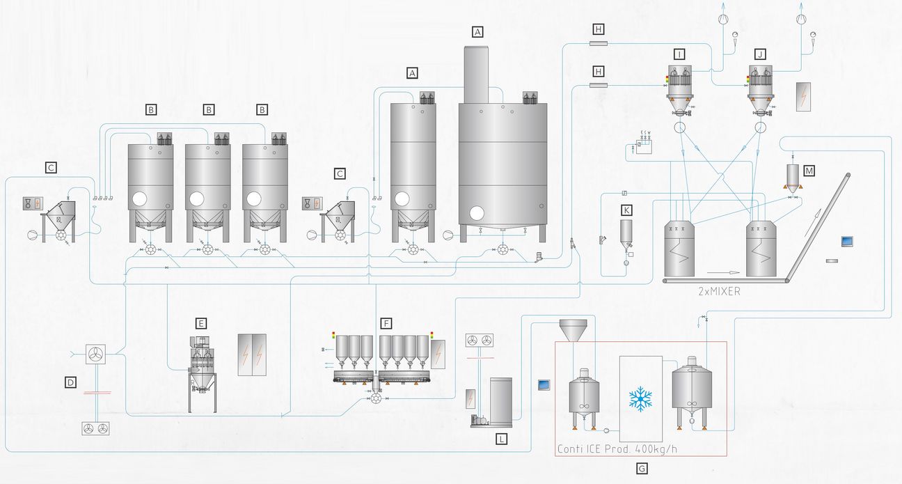 Ingredient conveying: Due to the high ambient temperatures, a vacuum conveying system with an integrated air-cooling and drying system was installed. The air, which is used for conveying, is cooled from 50 °C to approx. 10 °C, to make sure that the ingredients do not increase in temperature during transport.