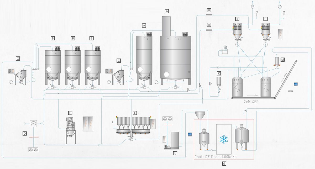 Storage - major ingredients: The 2 main-/macro ingredients (flour) are composed of 2 silos in various configurations. The silos are located in the ingredient storage room and are equipped with all construction- and design features according to ATEX explosion protection guidelines.