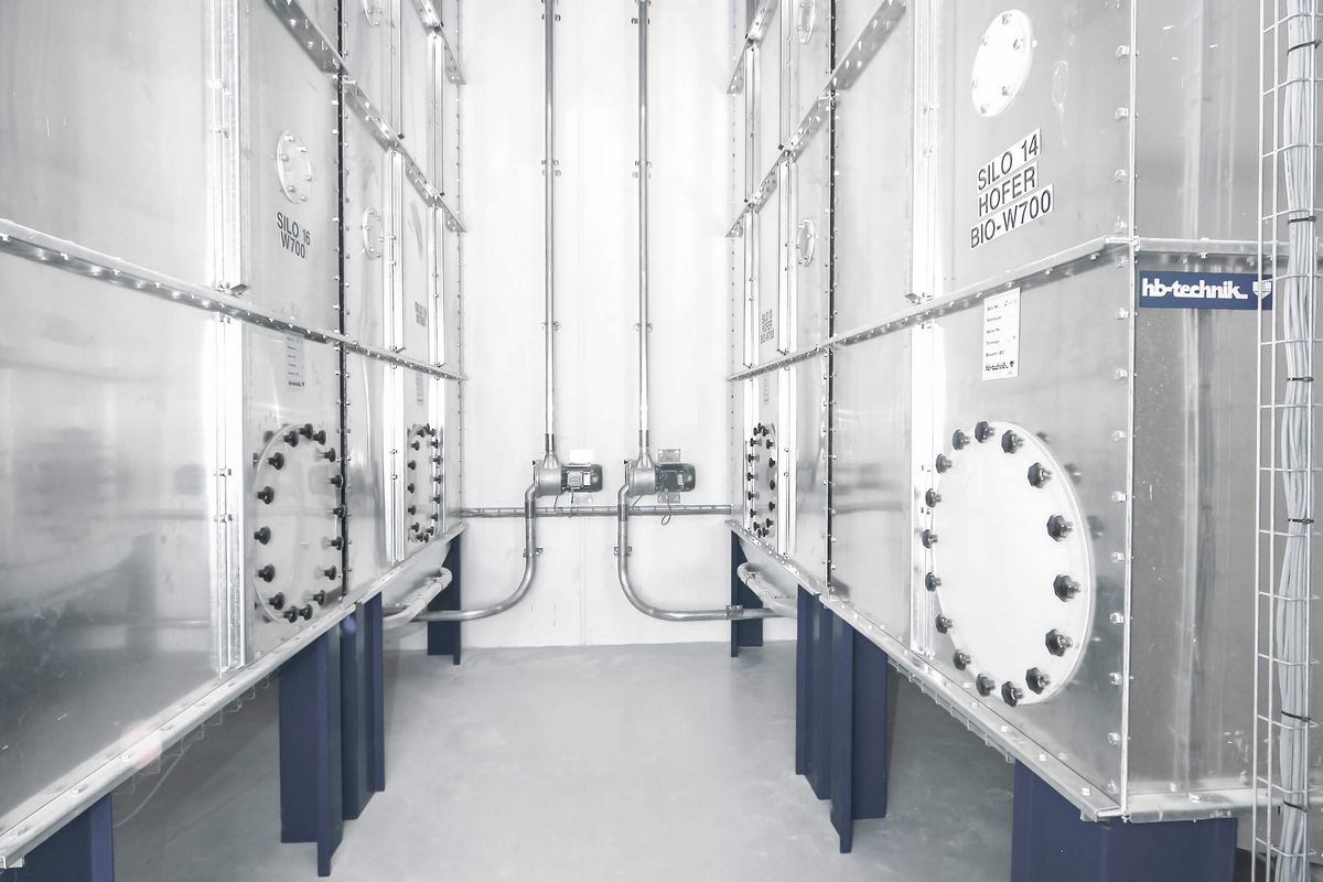 Storage 1: The large components consist of several silos in different versions (see photo samples). The silos are situated in the raw materials storage space according to ATEX guidelines. The silo bulking and flour feeding are carried out pneumatically by blowers from the machine room. The silo filling takes place over presieves and a tank lorry control cabinet attached to the outer wall of the building and individually laid silo filling pipelines with overfill protection with samplers.