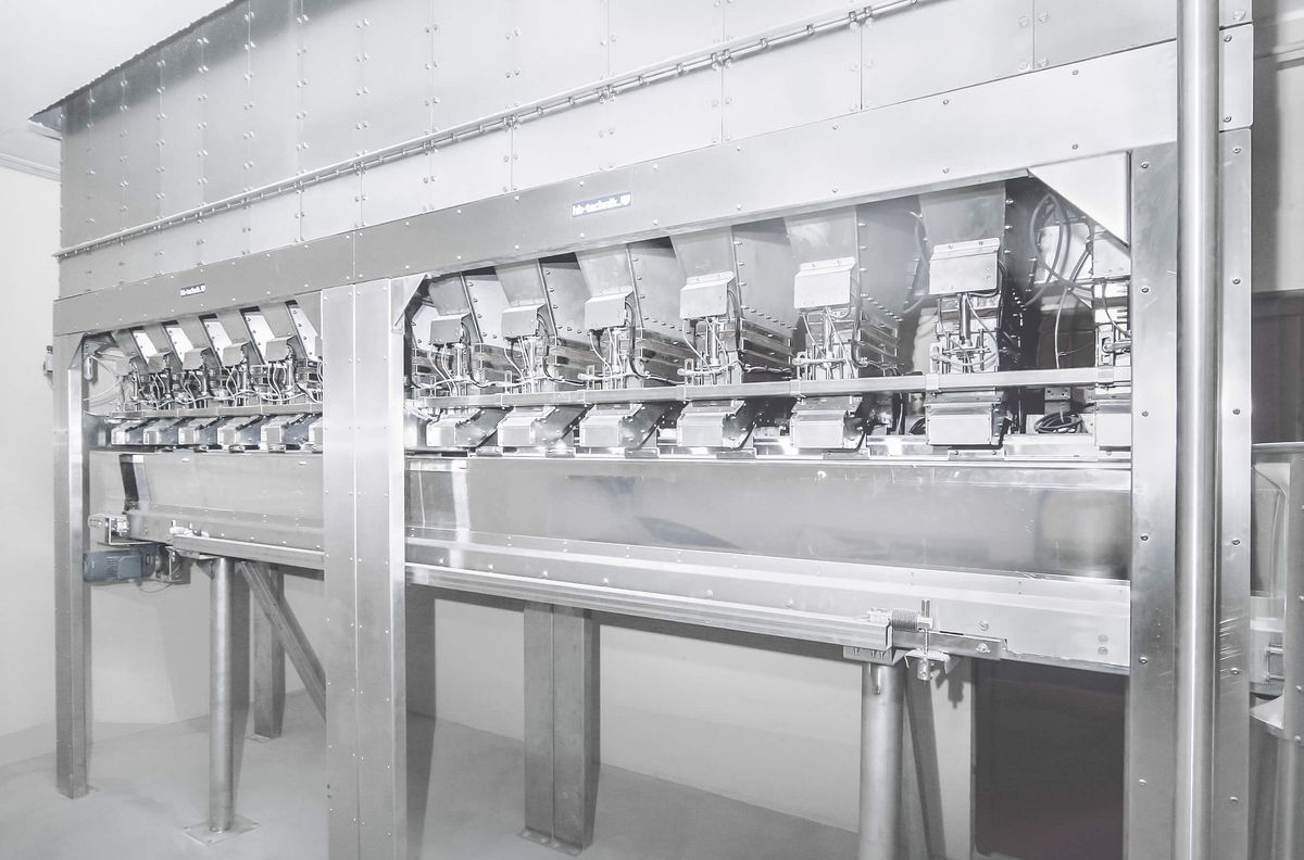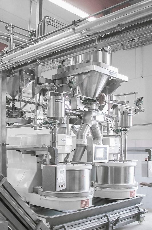 Weighing: The weighing of flour, medium and small components takes place in weighing hoppers with jet filters. The weighing hoppers are pneumatically filled. The capacity is between 80150 kg. The weighing hoppers are situated above the kneaders with discharge pipeline and branching mostly to 2 automatic kneading stations with dust exhaustion hood. Every target point has an online hand-add ingredient scale controlled by the recipe computer for special ingredients like raisins, spices, nuts, fat, ice, etc. Small ingredient containers are integrated in the hand-add ingredient scale tables.