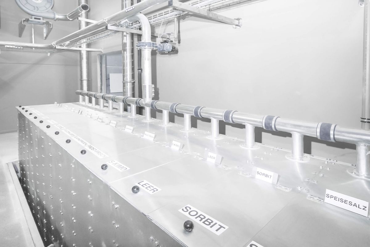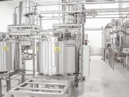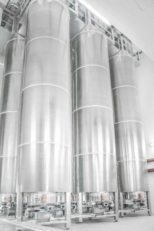 Storage – production: The production and storage systems for predough mostly consist of 3 Europro sourdough machines for automatic 3-stage rye sourdough with a capacity of 2,500 litres each. Furthermore, wheat sourdough machines with a capacity of 2,500 litres and tanks for cold- and hot-soaked grains with automatic metering. Aroma sour fermenting machine of 600 litres capacity and chilled aroma sour storage container of 600 litres capacity. Moreover, the yeast container is stored in the cold room. All liquid machines are equipped with automatic cleaning programs. Yeast and wheat predough pipes are cleaned automatically by a water flushing system. The oil container and metering facility are likewise integrated in the same storage room for liquid components.