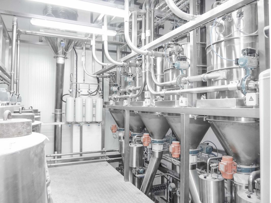 Flour-ingredient feeding: The flour feeding system mostly consists of a conveying line to the bread production line with branching to the sourdough and predough machines and to their automatic flour filling. Another separate flour feeder line leads to the organic products target point. The next flour feeder line leads to the biscuit target point. The other feeder lines for medium and small components lead likewise to the target points for bread and biscuit lines as well as separate line to the organic target point. For hygienic purposes, all flour and ingredient lines are pneumatically operated. The pipelines are made of stainless steel. Inline pipe sifting machines are used after the silos respectively.