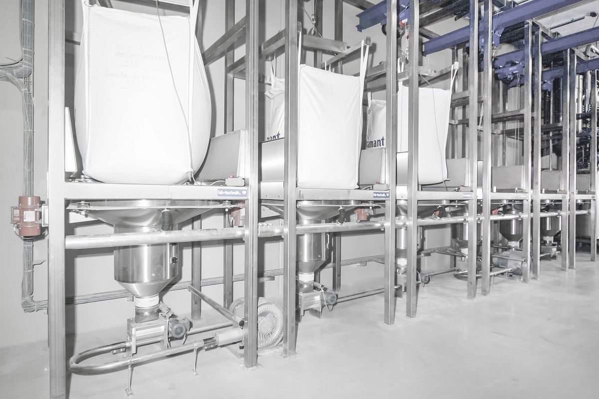 Storage 2: The medium components mostly consist of big bag or bag dumping stations. The stations are attached to the central aspiration system. The bulking and conveyance of material to the target points takes place pneumatically by blowers from the machine room.