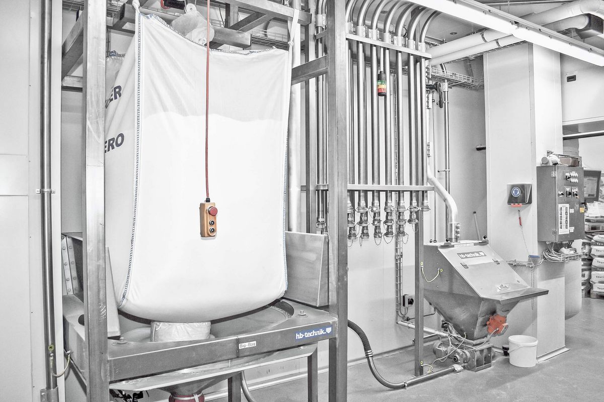 4. Medium components such as grains, coarse meal and flour mixes are delivered by Trevira big bags and suspended according to requirement in the automatic big bag