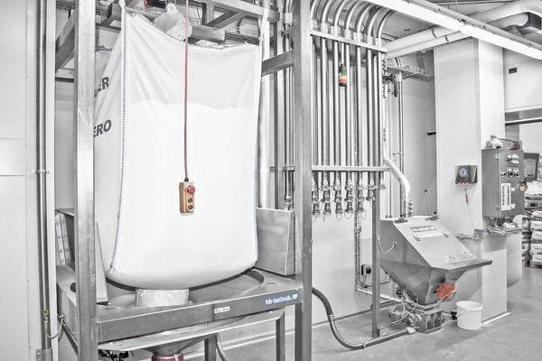 In most cases, large-, medium- and small-components are conveyed to central weighing stations. The medium components are mainly conducted as big bag stations, blending silos or bag dumping stations (= day stock silos). The central weighing stations respectively feed two automatic kneading stations.