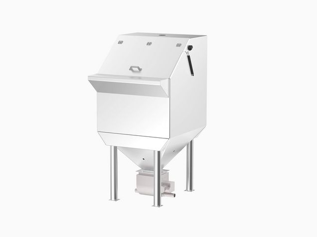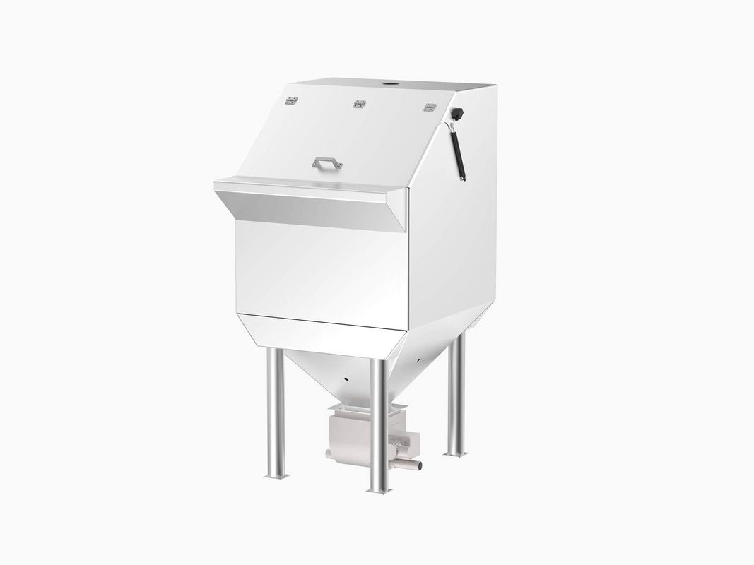 Hopper for storage and discharge of powdery, coarse meal, crystalline and grainy products like salt, sugar, flour, bakery improvers, shreds and grains from bags with rotary valve or conveying screw. Utilized for filling of silos, weighing hoppers, containers or feeding soaking-tanks or sourdough machines.