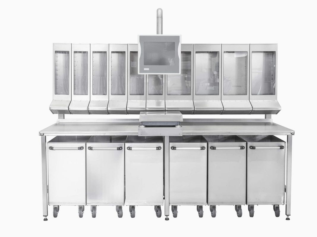 The manual weighing takes place over the ingredient scale. The hb-ingredient scales have an interface to connect to the recipe computer or backcontrol. The ingredient storage constists of hygienic-design stainless steel containers of various sizes