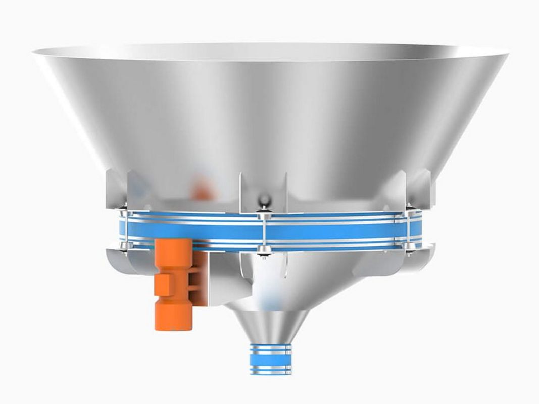 Silo discharge: The vibrating bottom, fixed on the cone flange with well dimensioned suspensions, is brought into vibration by the attached vibration motor. Thereby the stored material flows constantly through a special unloading installation to the outlet. The further conveying of the stored material can be done pneumatically with blow-through rotary valves, flow-through rotary valves, or with conveying screws.