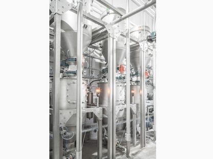 Automatic weighing, storage and safe, quick discharge of powdery, grainy or ground products from silos, bag dumping stations, Compo, big-bag stations via electro-pneumatic shut-off valve and swivel pipe or two-three-way separators into dust aspiration hoods or kneaders.
