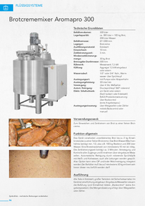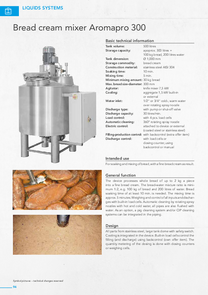 Das Gerät verarbeitet unzerkleinertes Brot bis zu 2 kg Einzelbrotstücke zu einer feinen Brotcreme. Das Brot-Wasser-Mischverhältnis beträgt min. 1:2, also z.B. 100 kg Restbrot und 200 Liter Wasser. Eine Broteinweichzeit von mindestens 10 min ist nötig. Die Zerkleinerungszeit beträgt ca. 5 Minuten. Verwiegung und Kontrolle aller Zugänge und Entnahmen über eingebaute Messzellen. Automatische Reinigung durch rotierende Sprühköpfe mit Heiß- und Kaltwasser, auch alle Leitungen werden gespült. Also Option kann eine CIP und/oder Molchreinigung integriert werden.Der Behälter muß bis auf mindestens 50 kg entleert sein bevor dieser neu befüllt werden darf!
