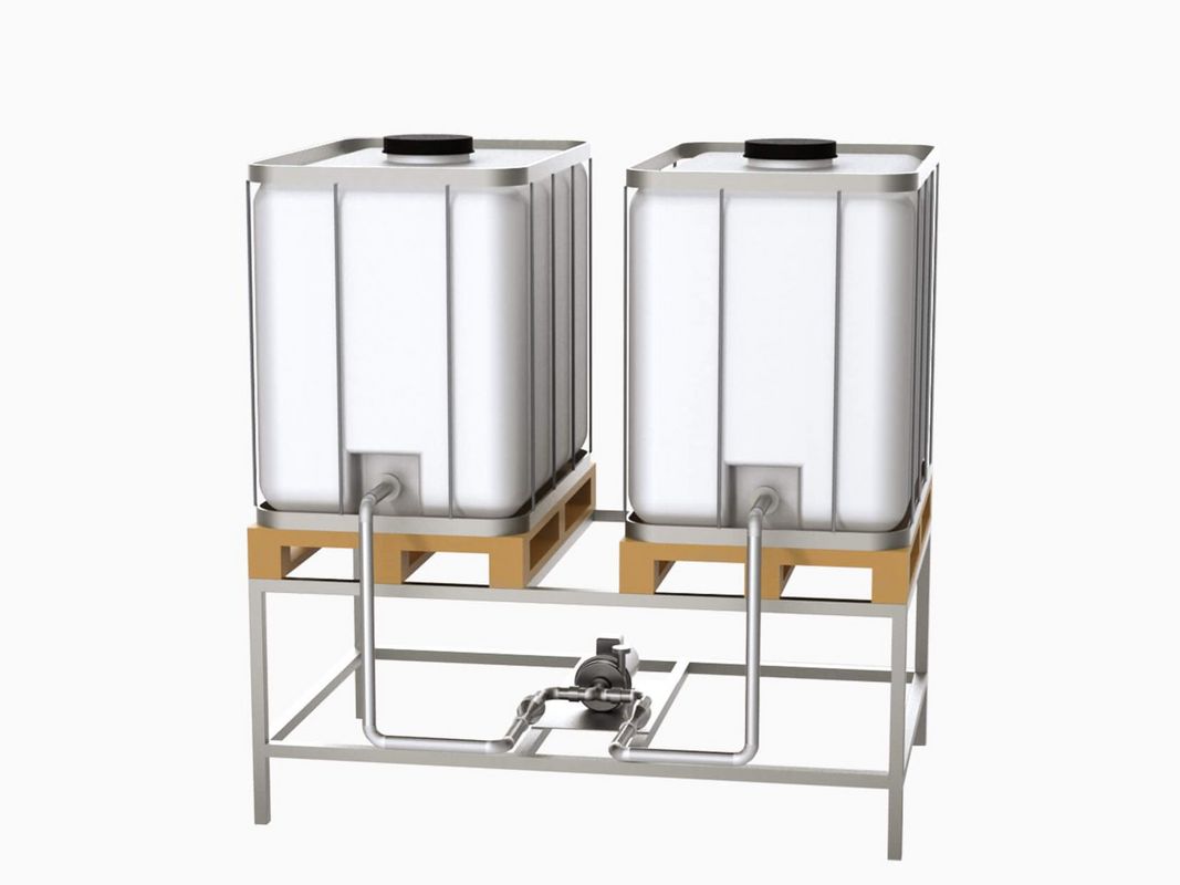 Verschiedene Rohstoffe werden von den Herstellern in Containern angeliefert. Damit auch diese Rohstoffe automatisiert werden können, werden Kupplungs- und Dosiermodule von hb- Technik standardisiert angeboten. Die Container werden entweder auf ein Gestell mit einem Stapler gehoben oder am Boden stehend an eine flexible Schlauchrohrleitung angeschlossen. Diese Rohrleitungen münden über einen Trockenlaufsensor in eine Pumpe, von der aus über eine Flüssigförderleitung, welche auch isoliert und gekühlt sein kann, zu den jeweilig angeschlossenen Knetstationen gefördert wird. Über Zähler wird die genaue Dosiermenge pro Knetstation realisiert.