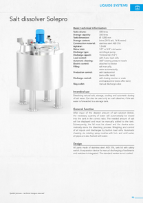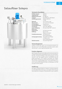 Nach Eingabe der gewünschten Menge Sole wird automatisch im richtigen Verhältnis die nötige Wassermenge in den Tank dosiert. Die dazu erforderliche Menge an Salz wird angezeigt und muss manuell in den Tank gegeben werden. Anschließend wird der Deckel geschlossen und es beginnt automatisch der Auflöse-Rühr-Vorgang. Verwiegung und Kontrolle aller Zugänge und Entnahmen über eingebaute Messzellen. Automatische Reinigung durch rotierende Sprühköpfe mit Heiß- und Kaltwasser, auch alle Leitungen werden gespült.