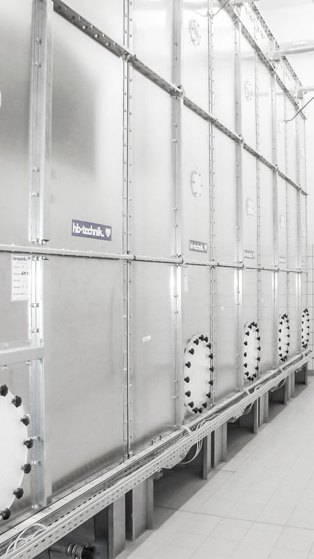 Silomantelmaterial: Produktberührende Teile aus lebensmittelechtem Material mit Versteifungen, Schaugläsern und Einstieg aus Plexiglas.