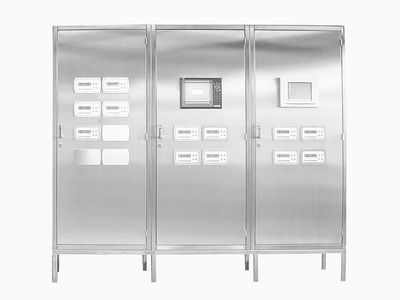 Der Schaltschrank ist in Edelstahl blank oder Stahlblech lackiert ausgeführt. Beim Öffnen der Schaltschranktür wird die Stromspannung im Schaltschrank abgeschaltet. Die gültigen Sicherheitsvorschriften nach den einschlägigen Ländernormen werden eingehalten. Ein Schaltplan liegt im Schaltschrank bei.Die tatsächliche Schaltschrankgröße wird nach dem Schaltplan berechnet.