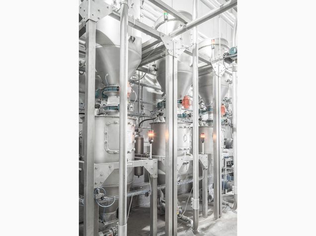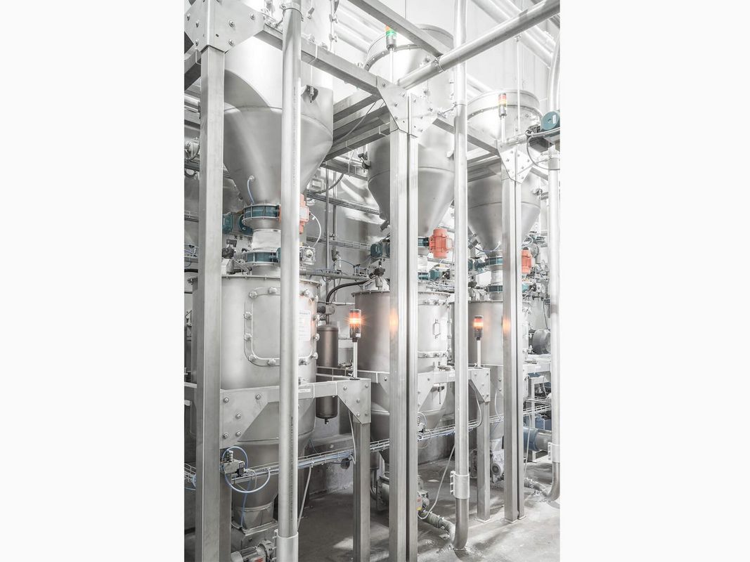 Behälterwaage zur pneumatischen Befüllung. Entleerung über Ablaufrohr, Drehrohr oder Verteilerklappkasten. Die Druckluft für Jetfilter ist bauseits zu erbringen.
