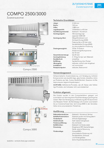 Die Zutaten werden in den Compobehältern gelagert und automatisch auf die integrierte Förderbandwaage grammgenau dosiert. Nach der Verwiegung und Dosierung aller Komponenten des Rezeptes fördert die Bandwaage alle Zutaten automatisch bis zur Zutatenschüssel bzw. bei Compo3000 in den Sendebehälter einer pneumatischen Förderlinie.