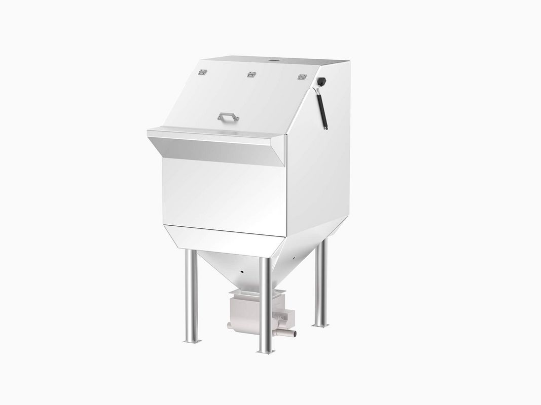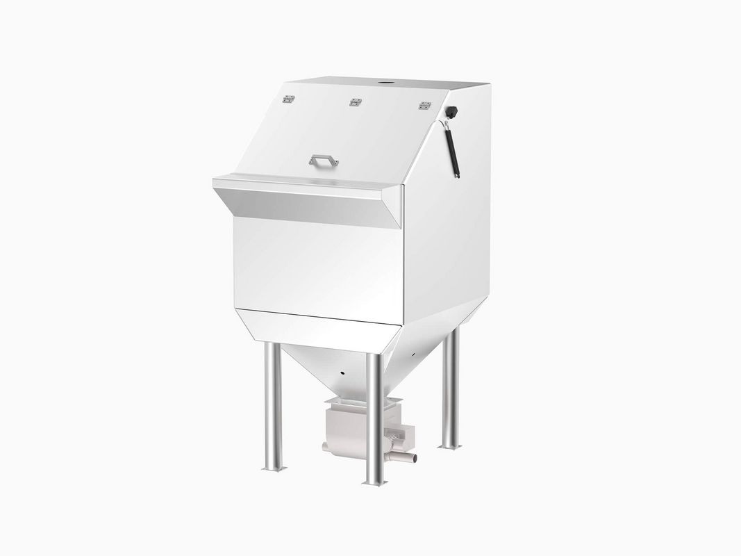 Behälter zum Lagern und Austragen von staubförmigen, geschroteten und körnigen Produkten, wie z.B. Salz, Zucker, Mehl, Backhilfsmittel, Schrot, Getreide, aus Säcken über eine Schleusen oder Förderschnecke. Dient zur Befüllung von Silos, Waagen, Behältern, Quell-/Brüh-/Kochstückmaschinen oder Sauerteigmaschinen.